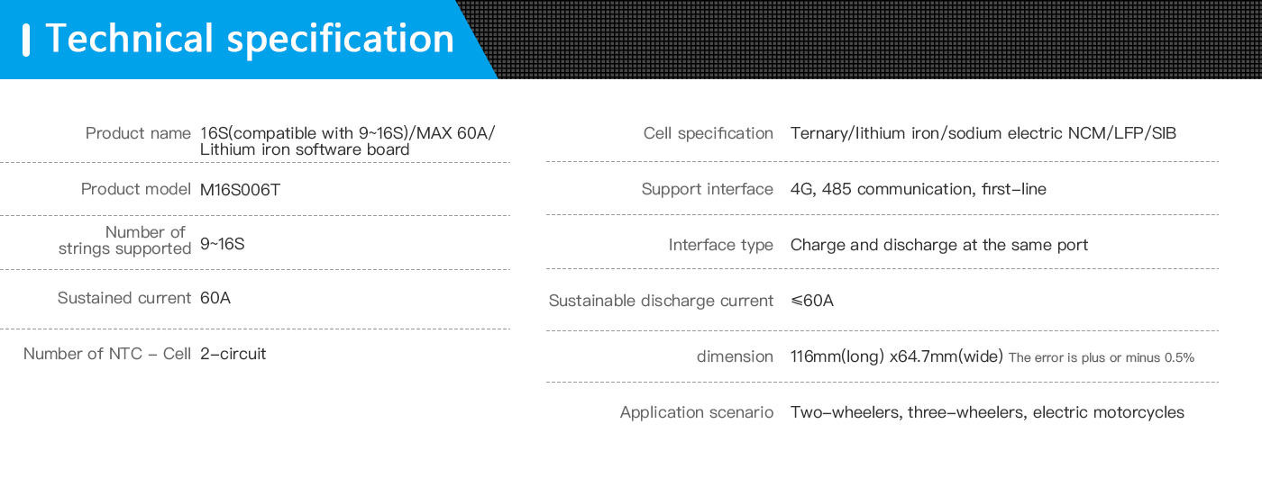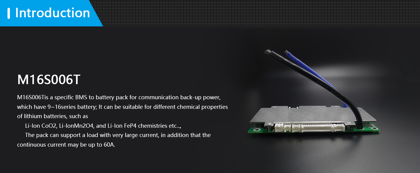 Hippo M16S006T is a protection board solution specially designed by our company for 9~16 battery packs of power batteries; it can be used for lithium batteries with different chemical properties, such as lithium ion, lithium polymer, lithium iron phosphate, etc. This protection board has a strong load capacity and the maximum continuous current can reach 50A.