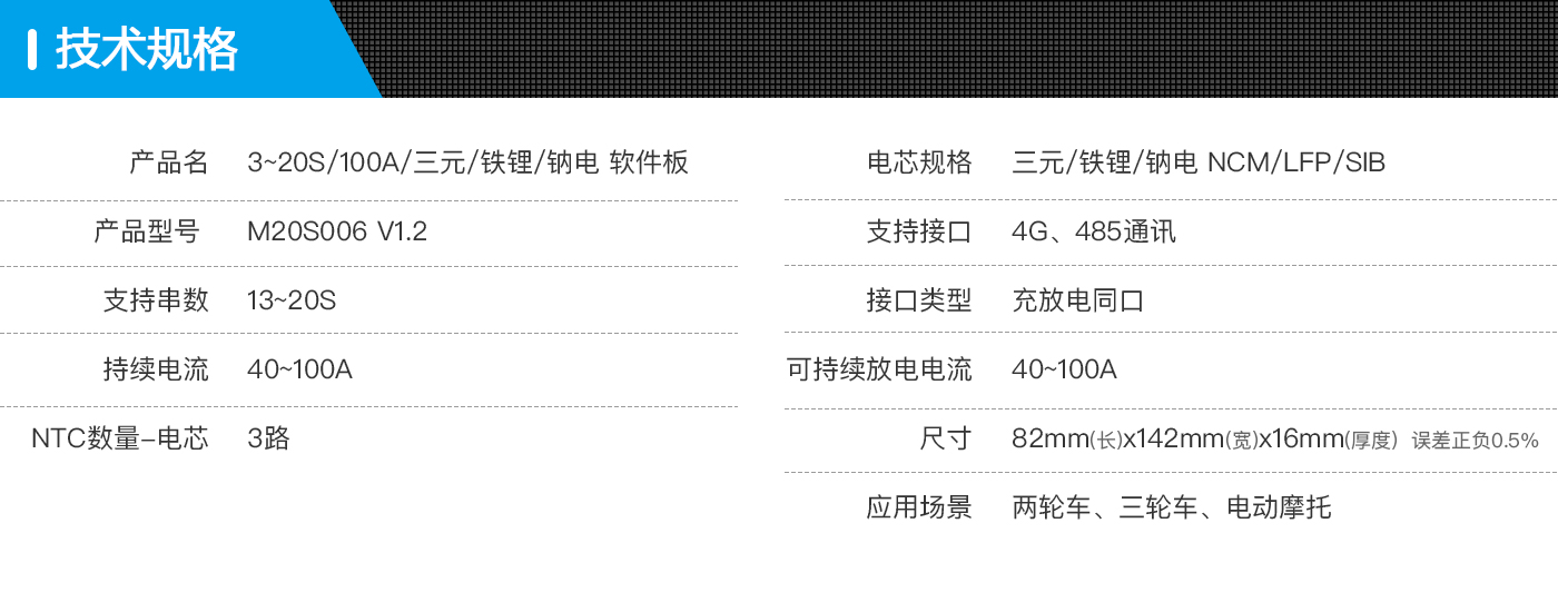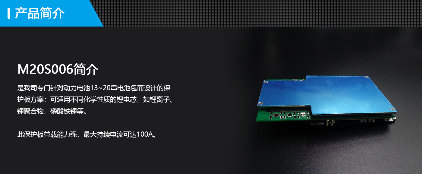 河馬BP-M20S006是我司專門針對(duì)動(dòng)力電池13~20串電池包而設(shè)計(jì)的保護(hù)板方案;可適用不同化學(xué)性質(zhì)的鋰電芯,如鋰離子、鋰聚合物、磷酸鐵鋰等。此保護(hù)板帶載能力強(qiáng),最大持續(xù)電流可達(dá)100A。